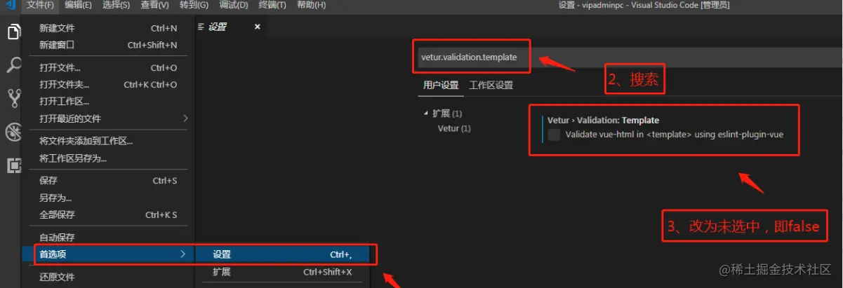 打开设置,搜索“vetur.validation.template”,设置完毕之后记得重启vscode