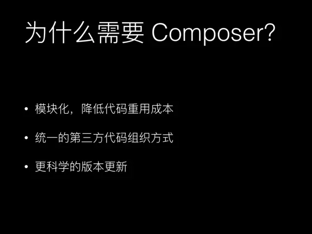 不信你可以找一些旧的项目看看,在没有 Composer 之前的项目中,你会发现大量的重复代码,以及各种花样的组织格式,各种规范的写法。这也是 Composer 诞生的原因之一。