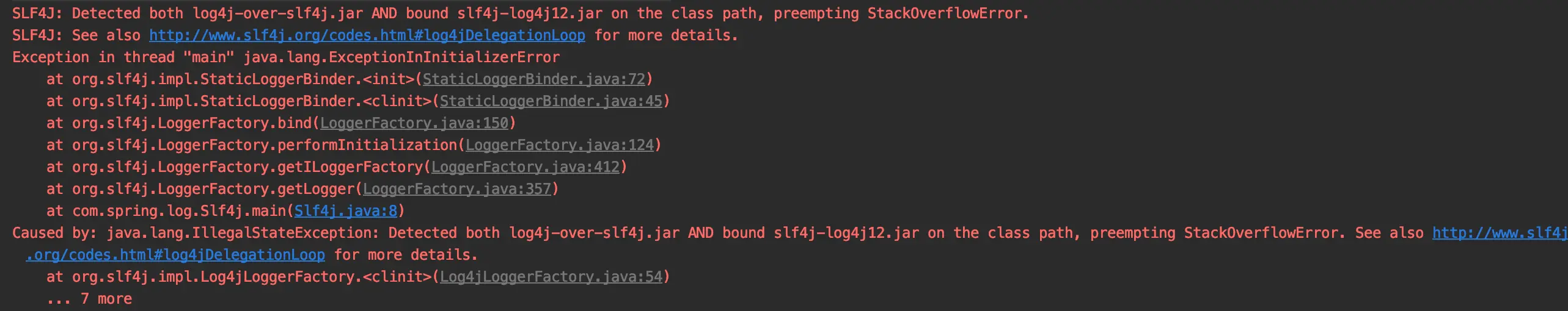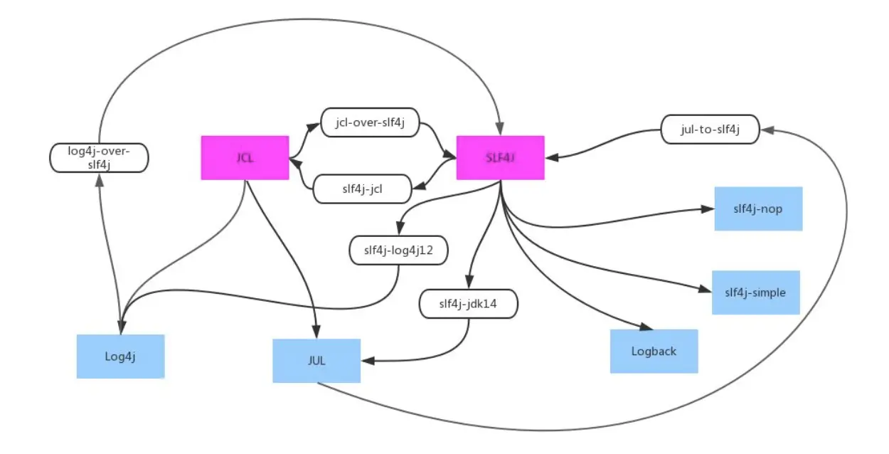 可以看到甚至 Log4j 和 JUL 都可以桥接到SLF4J,再通过 SLF4J 适配到到 Logback!在这里需要注意不能搞出循环的桥接,比如下面这些依赖就不能同时存在: