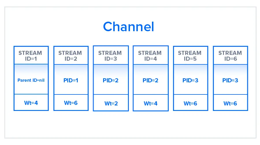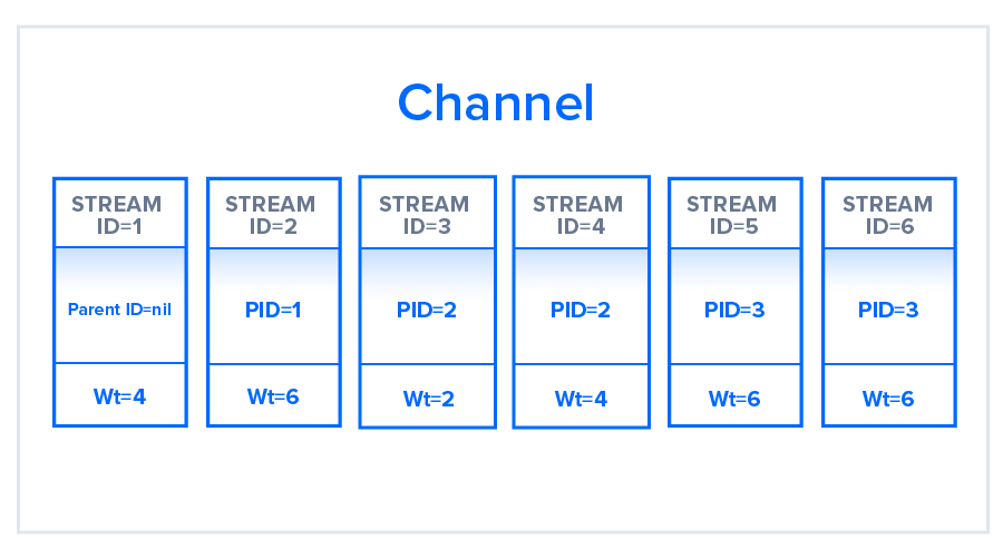 依据上图,首先,所有可用资源分配给直接关联root的 stream 1,依赖树中表明 stream 2 依赖于 stream 1 的完成,故 stream 2 直到 stream 1 任务完成后才能被处理。