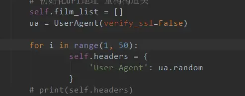 print(ua.random) #随机打印任意厂家的浏览器6. 我们可以再初始化init方法,添加ua.random,让它随机的产生;其中UserAgent代码如图:(这里设置随机产生50个挑选其中一个进行请求)