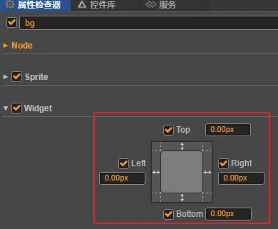 【1】新建单色精灵节点bg,添加适配组件Widget,设置距离上下左右分别为0,或者设置bg节点的大小跟Canvas分辨率一致。如下图所示: