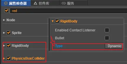 【2】新建单色精灵节点red,设置节点颜色为红色,添加RigidBody,设置Type属性值为Dynamic,表示此节点位置可变。添加PhysicsBoxCollider。
