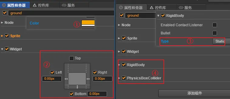 【3】新建ground单色渲染节点,设置颜色,设置适配,添加RigidBody组件,设置Type属性值为Static,表示地面位置固定,添加PhysicsBoxCollider组件,如下: