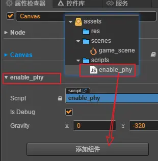 【2】实例化得到组件的实例,通过节点上的【添加组件】按钮,或者在代码中使用addComponent方法。如下图所示,通过编辑器,给Canvas节点上添加用户自定义脚本组件enable_phy,开启物理引擎。