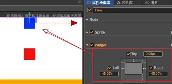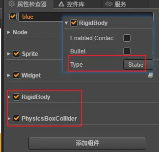 如上图所示,新建单色渲染节点blue,添加Widget组件,使得蓝色块位于顶部。作为旋转绳子的挂载点。同时,给blue节点添加RigidBody,设置其Type属性为static,静止的。添加PhysicsBoxCollider。