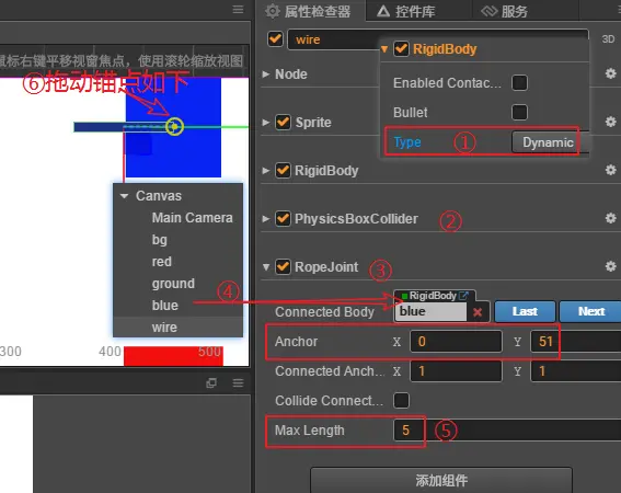 如上图所示,新建单色渲染节点,修改节点大小,设置节点颜色;添加RigidBody组件,设置Type属性为Dynamic,可以运动;添加PhysicsBoxCollider;点击【添加组件】按钮,选择【物理组件】-【Joint】-【Rope】,设置最大Max Length为5,将blue节点拖动到Connected Body,表示绳子连接点为Blue节点,然后拖动绳子上的圆圈,可以修改锚点。