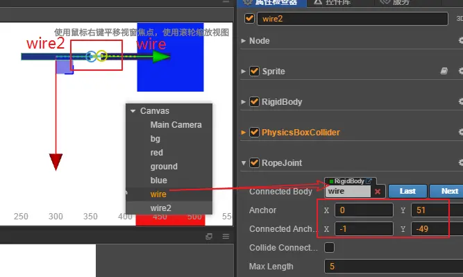 复制wire节点,得到wire2节点,修改相关属性如下即可,主要修改wire2连接的刚体为wire,连接上第一段绳子,调整连接的锚点如下图。
