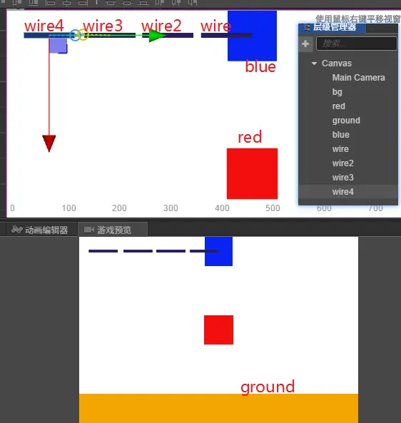 同样的道理,我们复制wire2得到wire3,修改wire3连接的刚体为wire2,调整连接锚点,复制wire3得到wire4,修改wire4连接的刚体为wire3,调整连接锚点。如此,一条具有四段的绳子已经制作好了。如下图: