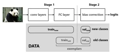 这篇文章首先假设增量学习的方法,相比于直接使用所有数据进行训练的方法,性能下降大的原因,是因为CNN模型最后用于输出类别预测概率的全连接层向新增加的类别偏移了(即更倾向于将类别预测为新加入的类别),并通过实验(固定网络前边的层并重新训练全连接层、混淆矩阵)验证了这个假设。为了解决这个问题,作者提出对新加入类别的概率进行修正,如上图所示。