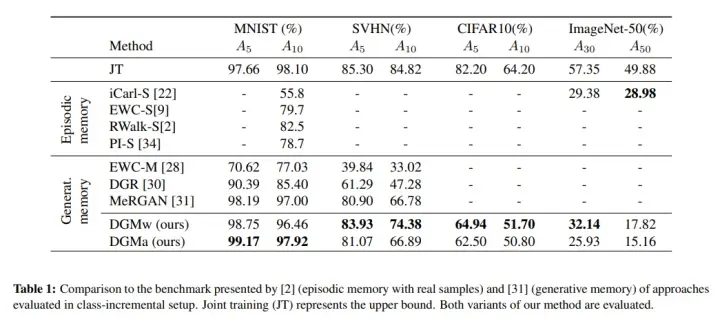 这篇文章提出了一种基于GAN的增量式学习方法,如上图所示。其中判别器(D)部分的设计与ACGAN基本相同,包括对抗损失和分类损失两部分;生成器的结构则比较特殊。具体来说,本文提出的生成器除了需要学习生成器的权重之外,还要对每一层的权重学习一个mask。这个mask的作用是限制每次允许更新的权重,从而防止模型忘记之前学习到的东西。由于mask的存在,模型越往后可以更新的权重值也会越少,因此可能会导致生成器的生成能力不足。为了解决这个问题,作者提出在每次学习完新数据之后,增加生成器的参数量,从而保证生成器的生成能力不会明显下降。实验结果显示,在小规模的数据集上,该方法有比较明显的性能优势,如下表所示。