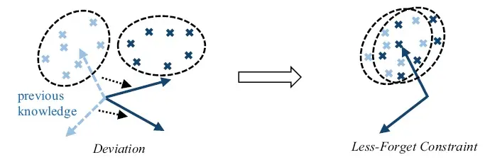 - 由于只能保存有限数量的旧类别样本,这些旧类别的样本不一定能够覆盖足够丰富的变化模式,因此随着模型的更新,一些罕见的变化模式可能会被遗忘,导致新的模型在遇到一些旧类别的样本的时候,不能正确地识别,这个现象被称作“灾难性遗忘”。