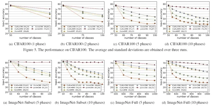 实验结果显示,相比于经典的LwF方法、iCaRL方法,本文方法在大规模、大增幅(一次加入的类别多)的数据库和设置下提升较明显,在小数据库上与已有方法性能相当,如下边的图表所示。