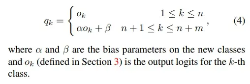 - 使用校验集的数据学习一个线性模型,对新模型预测的logits进行修正,其中保留旧类别上的logits,只对新类别上的logits进行修正,如下边的公式所示。