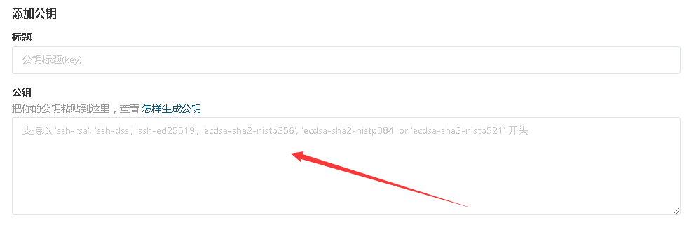 七、登录你的码云,配置公钥: 传送;把刚才复制的公钥粘贴到大框里,标题会自动取邮箱名,不爽就自己换啊~