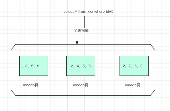 在innodb中磁盘以页为单位,一页等于16K,我们访问磁盘的时候访问的是逻辑分区,机器扫描计算机对应的物理分区。随机io的时候扫描不同的磁盘需要磁头不停的移动,我们需要的数据可能分布在不同的页中,在没有任何索引的数据库中寻找数据,此时数据库相当于一个文件系统,需要cpu进行全表扫描。而b+树的一棵树对应innodb的一页,我们每次访问数据库只需要加载对应的页,从树的节点一直找下去,在固定的次数总会在叶子节点找到响应的数据,b+这种数据结构完美的契合了innodb这种以页为单位的存储引擎。下图为无索引情况下全图扫描