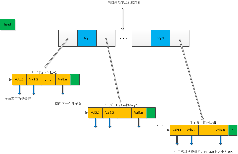 在b+树这种数据结构中,数据都存储在叶子中,非叶子结构存储着数据的指针,数据的左节点都比自己小,右节点都大于等于自己。底层的叶子节点数据头尾用链表串联起来。这种数据每次查询的次数稳定,范围查询时在底层用链表顺序查询,大大提高的查询效率。