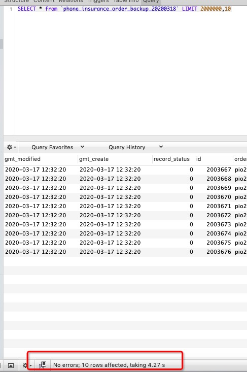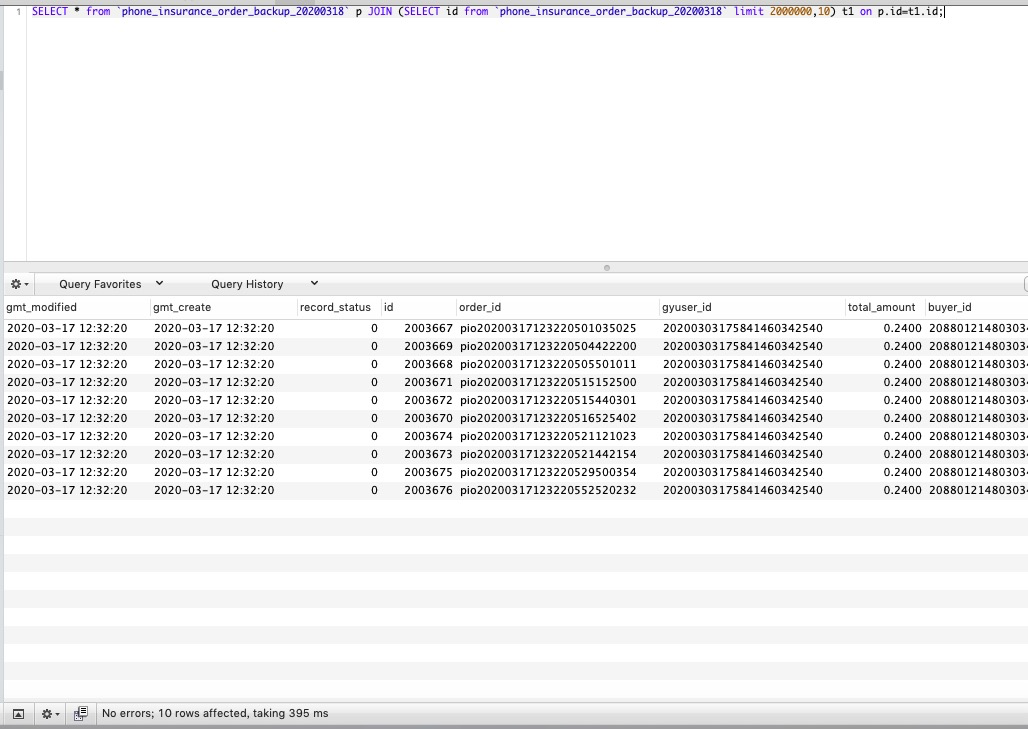SELECT * from `phone_insurance_order_backup_20200318` p JOIN (SELECT id from `phone_insurance_order_backup_20200318` limit 2000000,10) t1 on p.id=t1.id;