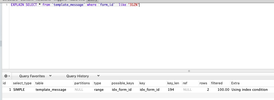 这还是针对联合索引单列进行模糊匹配的结果,实际上在此次的(form_id,retry_times)联合索引中,你可以认为数据库对form_id和 (formid,retry_times)都建立了索引,这样理解起来比较方便。