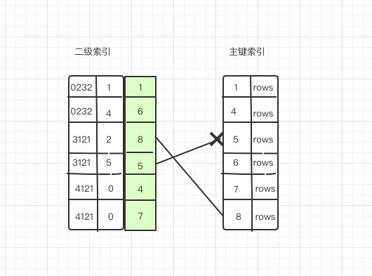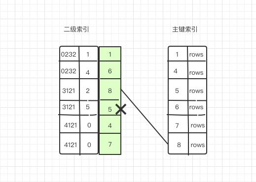 mysql在数据库中查找满足form_id like '312%'的值,主键为5和8的都满足,所以这两个都需要回表查询,主键为8的这一行不满足,放弃。这个查询一共回表两次。