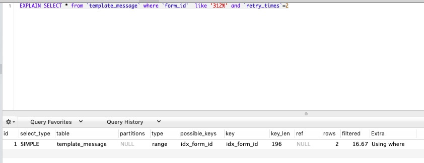 EXPLAIN SELECT * from `template_message` where `form_id` like '312%' and `retry_times`=2