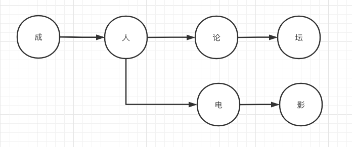 假设我们词库里有以下2个敏感词:成人论坛、成人电影,首先我们要建立一个这样的结构。