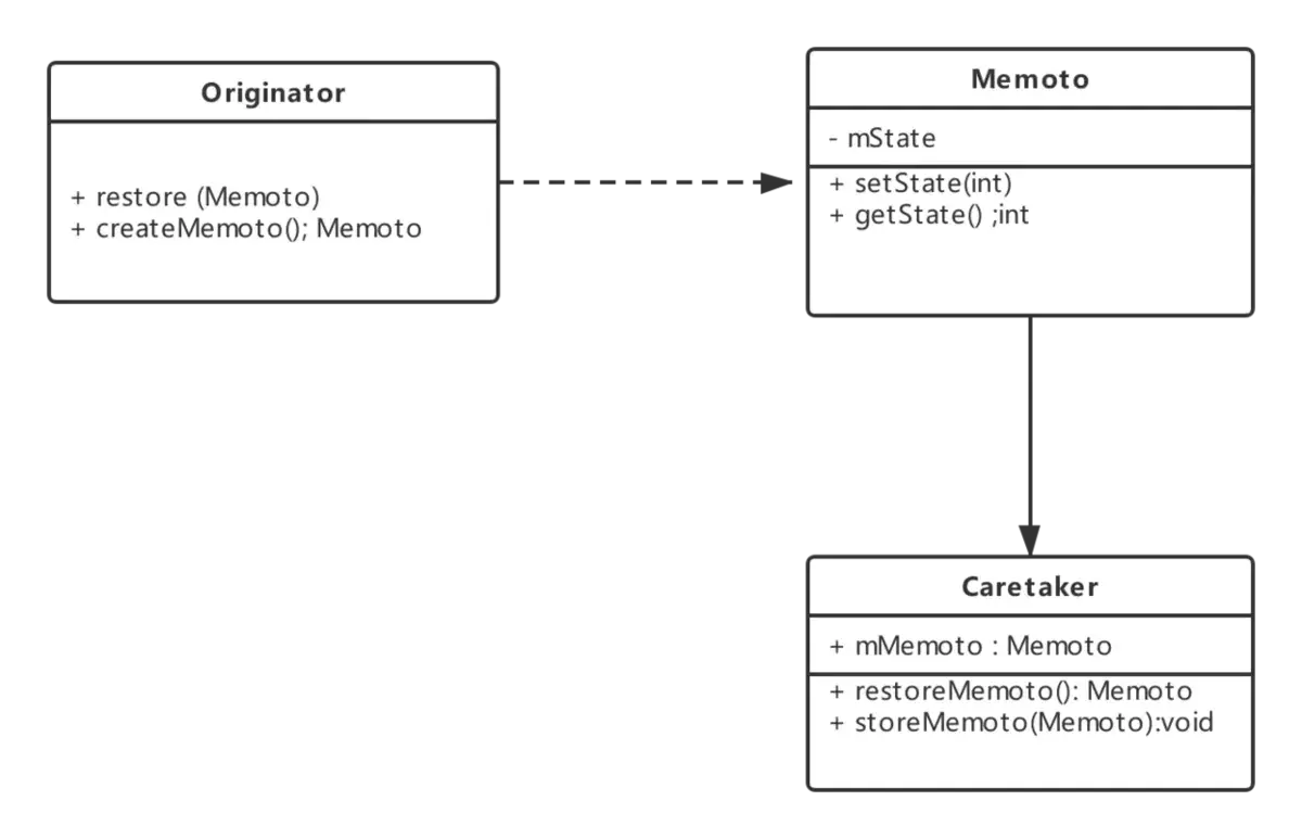 - 如果用一个接口来让其他对象得到这些状态,将会暴露对象的实现细节并破坏对象的封装性,一个对象不希望外界直接访问其内部状态,通过中间对象可以间接访问其内部状态。