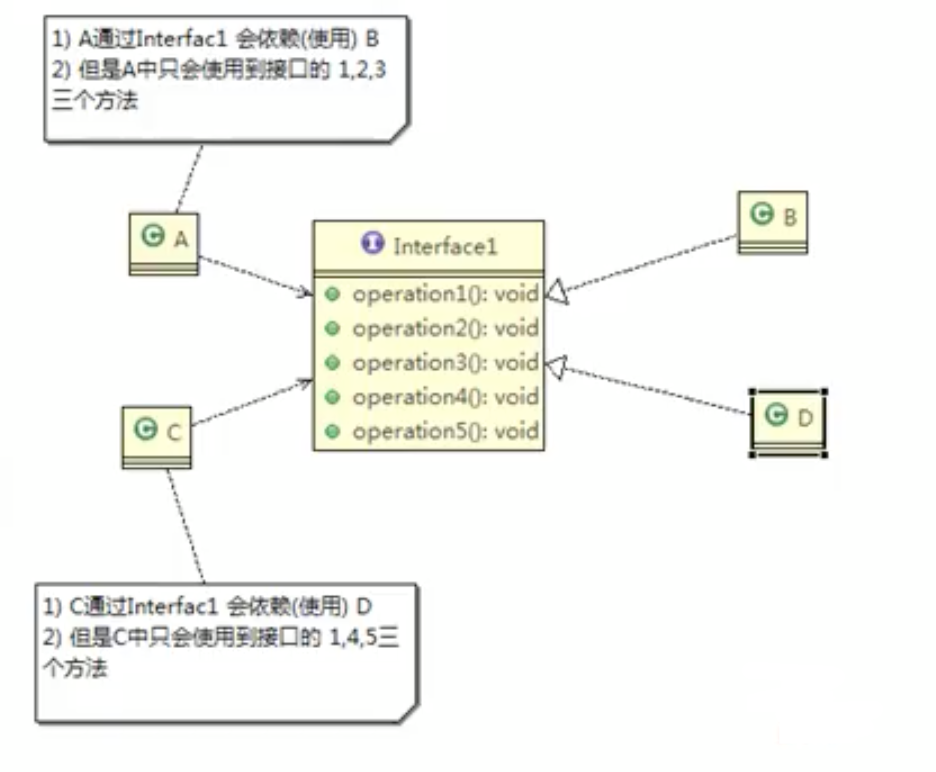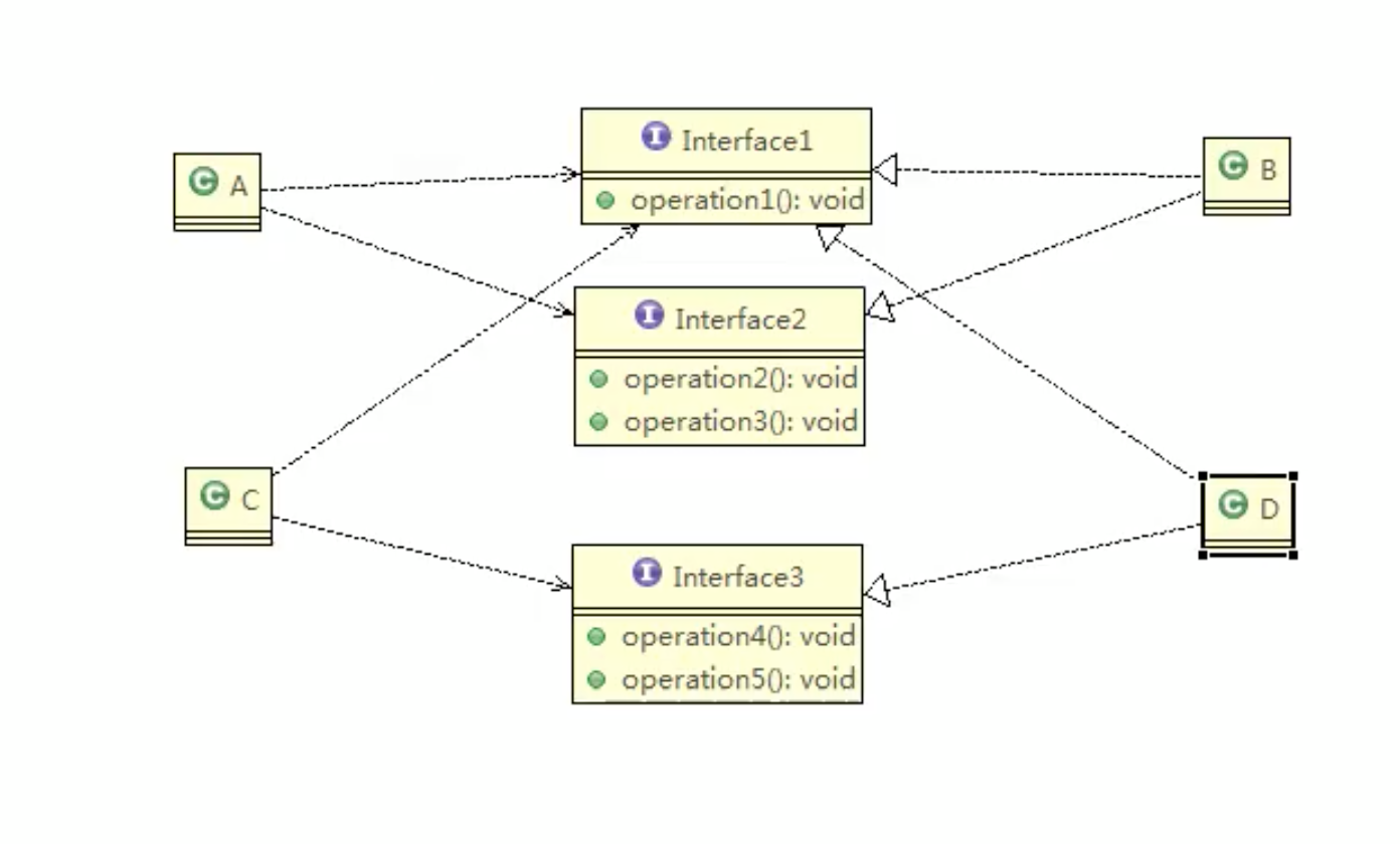 - ①类A通过接口Interface1依赖类B,类C通过接口interface1依赖类D,如果接口Interface1对于类A和类C来说不是最小接口,那么类B和类D必须去实现他们不需要的方法