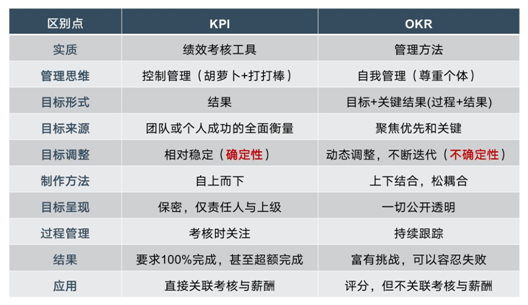 KPI走考核路线,是工业革命时代传承下来的控制性管理。上级制定目标,并进行考核,与考核薪酬挂钩,比较僵化。OKR走管理路线,更侧重员工的自我管理,它是动态可调整的。OKR鼓励员工去挑战自己,即使失败了,也不会被惩罚。
