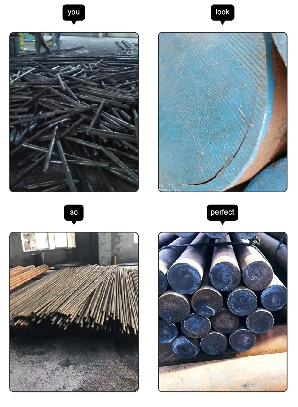 上面两个图是别家的,下面两个图是我的,左上图断的特别厉害,多方面原因,右上图显示端口裂痕,因为掉块会导致两头变尖快速,严重的会断棒,而我的不仅表面好看,用后无论直线度、圆度还是耐磨性、断棒率都表现不错,所以,虽说谁也不能保证产品一点问题也没有,但有些问题是可以提前避免的,也是有小技巧的,只有用心的人可以做到,我自觉我的棒磨机钢棒做的还可以,当然也出过问题,这么些年了,遇到过各种各样的问题,但我从来没怕过问题,也不逃避问题,好像还真没有解决不了的,我也不会让客户吃亏,出问题我承担,但是关键还是后续不要出问题,一次把事情做对固然很美好,但月有阴晴圆缺,还好,最近几年,吃过亏之后,还算稳定,只要你详细核算数据,在没有认何猫腻的前提下,我可以承诺没有比我的棒磨机钢棒性价比更高的,接受认何挑战,这篇文章算是战帖。