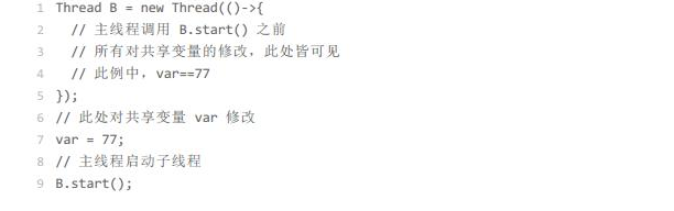 线程A启动线程B,线程B可以看到线程A调用B.star()之前所有的操作 eg :