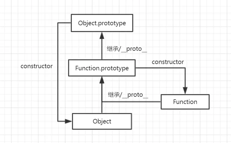 //Function.prototype 直接继承 Object.prototype。 Function.prototype.__proto__ === Object.prototype //true //Object本身是个(构造)函数,是Function的实例,即`Object.__proto__`就是`Function.prototype` Object.__proto__ === Function.prototype //true //Function.prototype 和 Function.__proto__ 为同一对象 Function.prototype === Function.__proto__ //true Function.prototype.constructor === Function //true Function.prototype instanceof Object //true Function.prototype instanceof Function //false