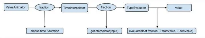 计算已完成动画分数 elapsed fraction。为了执行一个动画,你需要创建一个ValueAnimator,并且指定目标对象属性的开始、结束和持续时间。在调用 start 后的整个动画过程中,ValueAnimator 会根据已经完成的动画时间计算得到一个0 到 1 之间的分数,代表该动画的已完成动画百分比。0表示 0%,1表示 100%。