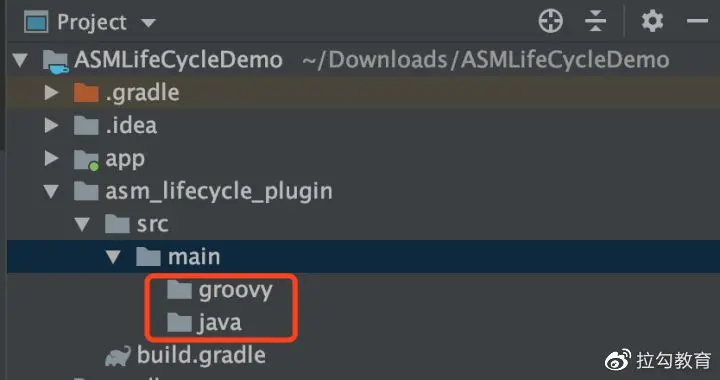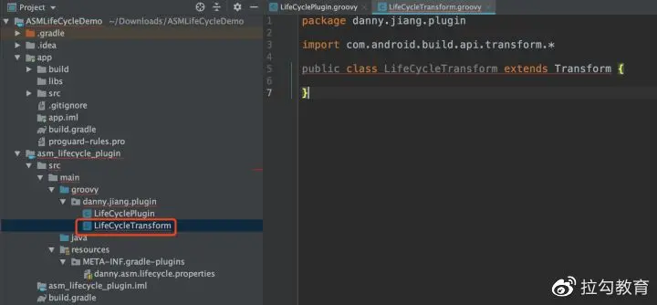 但 ASM 是 java 层面的框架,所以在 java 目录里存放 ASM 相关的类。 然后,在 groovy 中创建目录 danny.jiang.plugin,并在此目录中创建类 LifeCyclePlugin.groovy 文件。