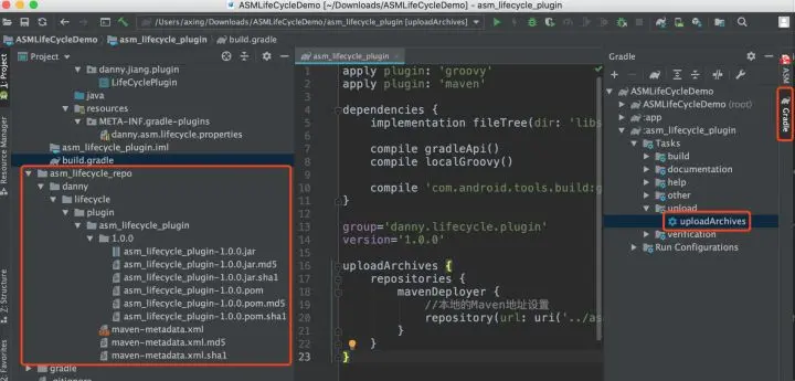 这里只是演示,所以只是将插件部署到本地目录中。具体地址通过 repository 属性配置,如图所示我将其配置在项目根目录下的 asm_lifecycle_repo 目录下。