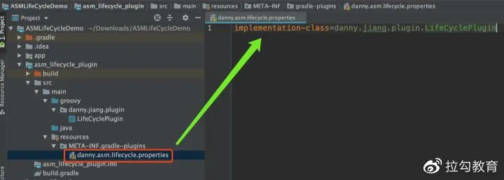 最后一步,创建 properties 文件。 在 plugin/src/main 目录下新建目录 resources/META-INF/gradle-plguins,然后在此目录下新建一个文件:danny.asm.lifecycle.properties,其中文件名 danny.asm.lifecycle 就是我们自定义插件的名称,稍后我们在 app module 中会使用到此名称。