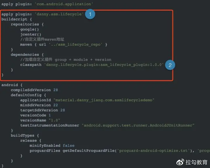 图中 ① 处就是在自定义 Gradle 插件中 properties 的文件名 (danny.asm.lifecycle)。图中 ② 处 dependencies 中的 classpath 是 group 值 + module 名 + version。