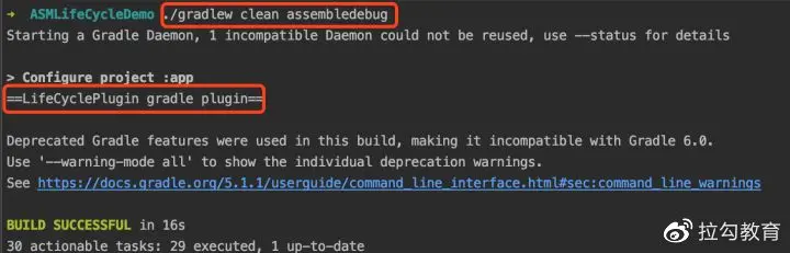 然后在命令行中使用 gradlew 执行构建命令,如果打印出我们自定义插件里的 log,则说明自定义 Gradle 插件可以使用:
