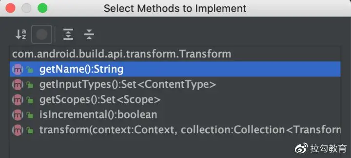 可以看到,LifeCycleTransform 需要实现抽象类 Transform 中的抽象方法,具体有如下几个方法需要实现: