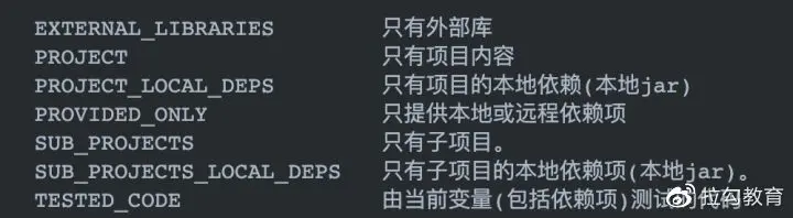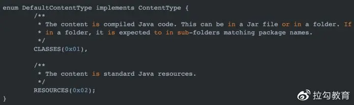 Gradle 在编译的时候,会将这个名称显示在控制台上。比如:Task :app:transformClassesWithXXXForDebug。 getInputType:在项目中会有各种各样格式的文件,通过 getInputType 可以设置 LifeCycleTransform 接收的文件类型,此方法返回的类型是 Set<QualifiedContent.ContentType> 集合。 ContentType 有以下 2 种取值。