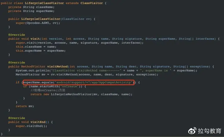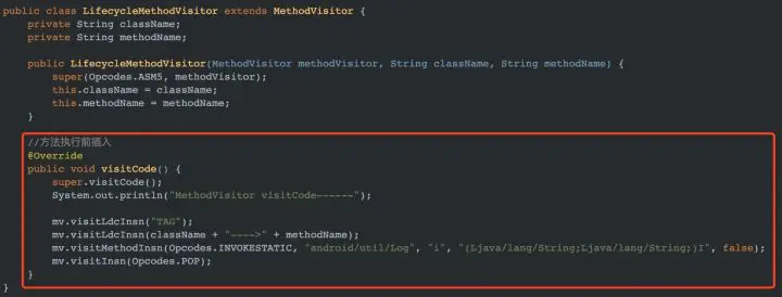 红框中,在 visitMethod 方法中,过滤出继承自 AppCompatActivity 的文件,并在 LifeCycleMethodVisitor.java 中对 onCreate 进行改造。 LifeCycleMethodVisitor.java