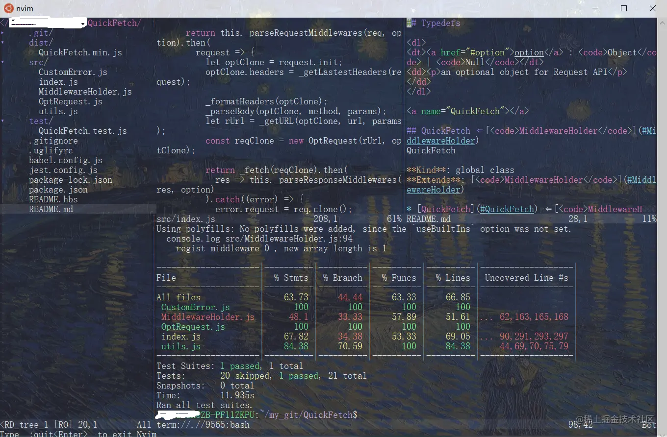 Ctrl + N: 打开终端,多页签切换到终端时需要用i和ESC切换其输入状态Alt + h\j\k\l: 在文件树和分割页间切换焦点:res+行数: 改变分割页的尺寸:quitall: 多个tab时一次性退出vim