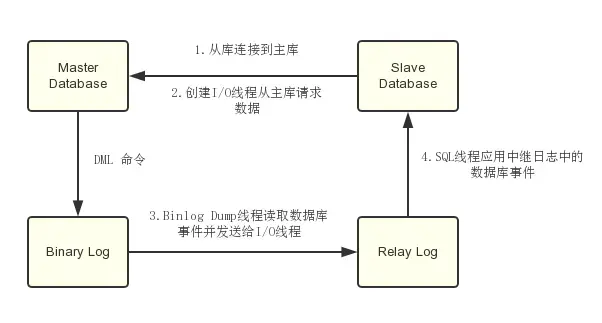 - 当在从库上启动复制时,首先创建I/O线程连接主库,主库随后创建Binlog Dump线程读取数据库事件并发送给I/O线程,I/O线程获取到事件数据后更新到从库的中继日志Relay Log中去,之后从库上的SQL线程读取中继日志Relay Log中更新的数据库事件并应用,如下图所示。