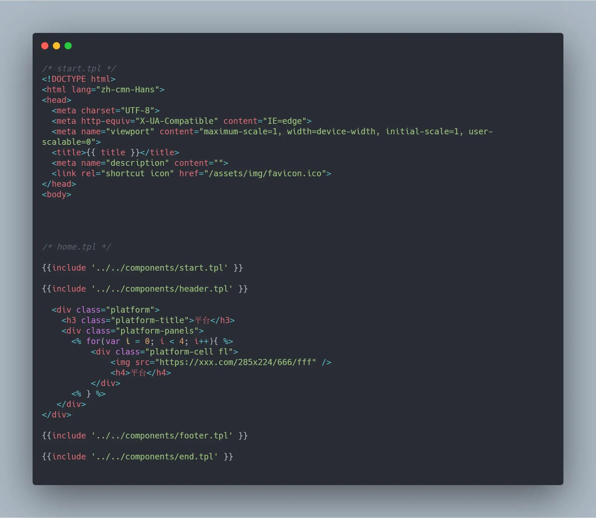 通过include即可引入到各个页面。在语法上还有有输出、条件、循环、子模版等,可根据各自项目进行相应的配置。