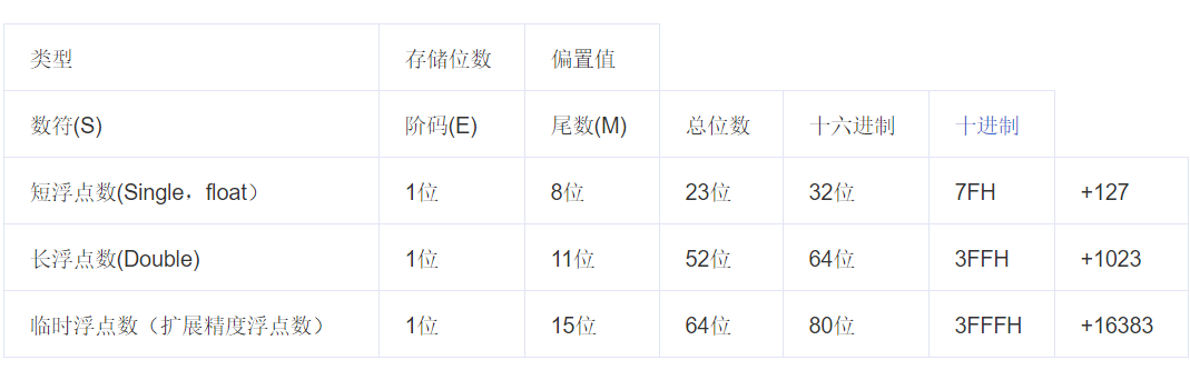**偏移量:是指浮点数表示法中的 指数域 的 编码值 为指数的 实际值 加上某个固定的值,用IEEE 754 国际标准规定该 固定值 为 2 的 (e−1)次方减 1 其中的e 为 存储指数的单位元 的长度 (即有几个 bit) (就是看一个浮点类型能表示指数部分最大范围)