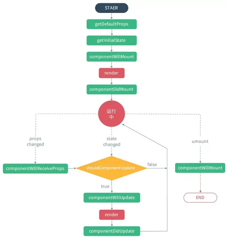 componentWillReceiveProps(nextProps): 该函数在组件进行更新以及父组件render函数(不管数据是否发生了改变)被调用后执行,this.props取得当前的props,nextProps传入的是要更新的props。通常是比较this.props和nextProps来重新setState。 shouldComponentUpdate(nextProps, nextState): 返回bool值,true表示要更新,false表示不更新,使用得当将大大提高React组件的性能,避免不需要的渲染。 componentWillUpdate: 预更新函数。 render: 渲染函数。 componentDidUpdate: 更新完成函数。 相比装载过程的生命周期函数,更新过程的生命周期函数使用的相对来说要少一些。常用的是componentWillReceiveProps、componentShouldUpdate,前者经常用于根据前后两个数据去设置组件的状态,而后者则是常用于优化,避免不必要的渲染。 4.组件卸载过程 卸载过程只涉及一个函数componentWillUnmount,当React组件要从DOM树上删除前,会调用一次这个函数。这个函数经常用于去除componentDidMount函数带来的副作用,例如清除计时器、删除componentDidMount中创造的非React元素。