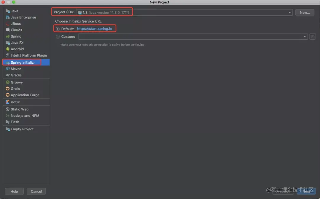 第2步:左侧选择Sping Initializer,右侧分别配置JDK以及初始化器的地址,使用默认地址start.spring.io/,点击Next