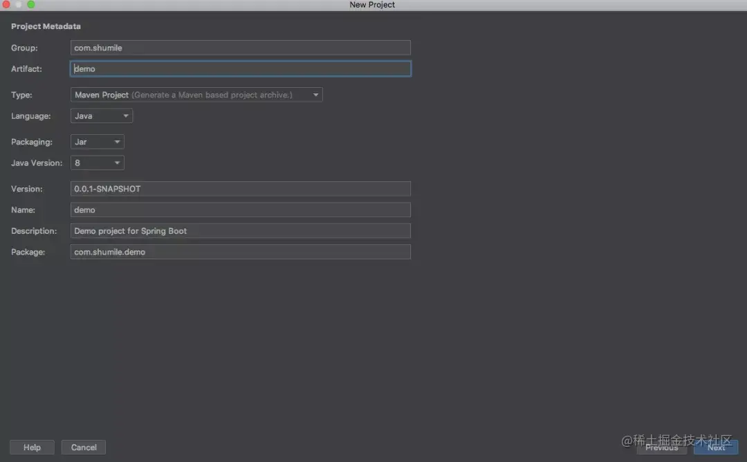 Tips:大家会常常采用另一种方式创建项目。在start.spring.io/ 页面直接进行Spring Boot的项目名称和依赖配置,配置好之后,再下载到本地,导入IDEA