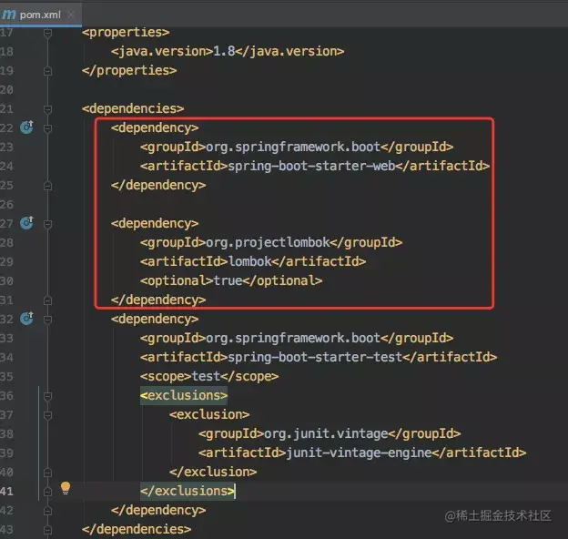查看pom文件,我们可以看到我们刚刚选择的两个依赖,IDEA结合Spring Initializer都帮我们配置在了pom.xml中