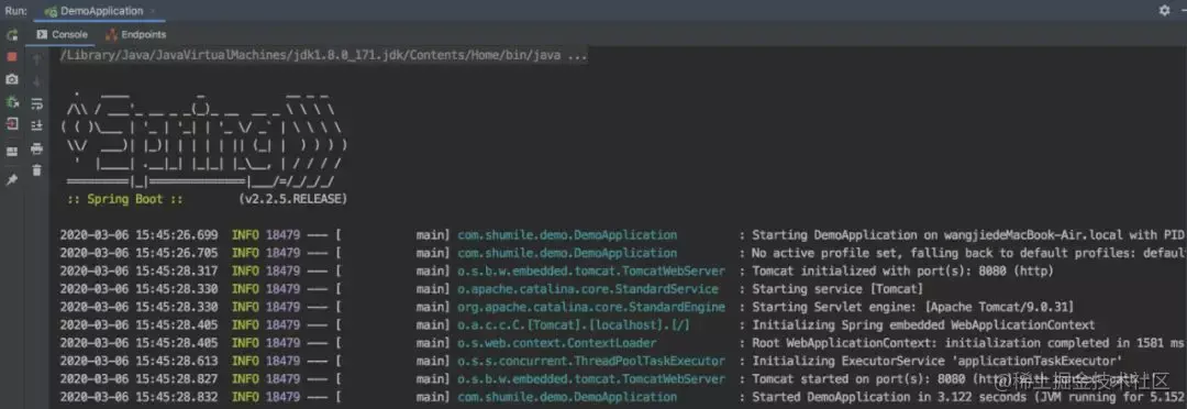 查看日志:显示 Started DemoApplication in2.444 seconds (JVM running for3.307) 表示启动成功